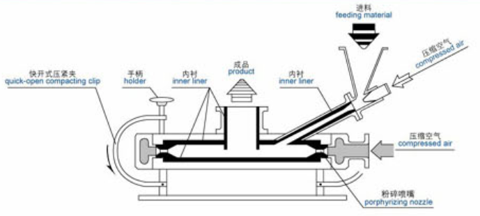 同时考虑清洁便利性,处理量,成品粉碎粒径,针对GMP工厂的平衡设计。优化后设备更小的设备尺寸,便捷的设备拆装。新的气流粉碎主机结构,无清洁死角,提升了粉碎性能。 均匀喂料通过均匀进料器向气流粉碎主机给料,并控制进料速度粉碎由连接在给料器上的文丘管吸入粉碎主机内部,粉碎腔压力气体和物料同时进入粉碎机,物料被高速气流粉碎带动,发生高速碰撞,产生粉碎效果。压缩空气伴随成品进入旋风分离器,气固分离气粉混和物高速进入上部圆筒体,粉料因质量大向下旋转运动至下出口质量小向上旋出,气固实现分离尾气过滤进入的气体中夹带少量的粉尘被过滤筒(袋)阻隔。含尘气体被过滤成洁净气体比较后从风机出口排出,气固彻底分离。